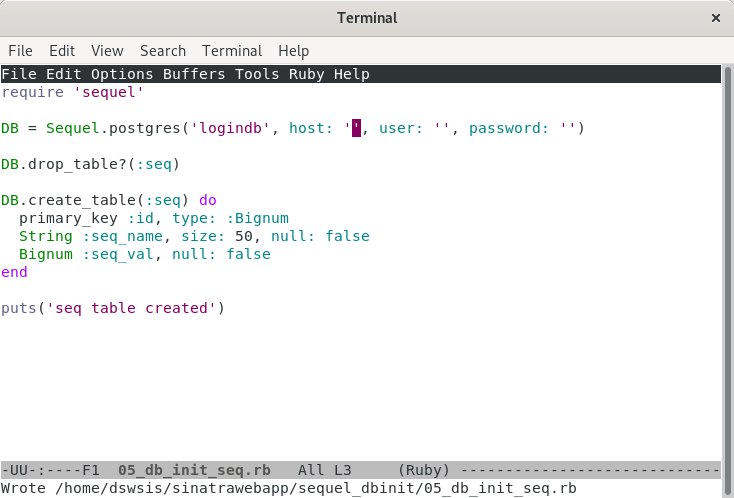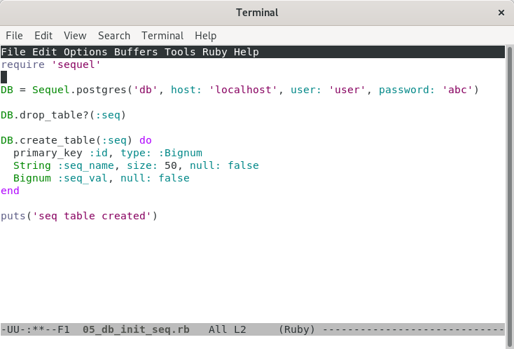 I opened a file with rb extension and emacs use ruby programming language highlighting right away. Edit some line and save it using save command C-x C-s. Emacs will show that it wrote to the file.