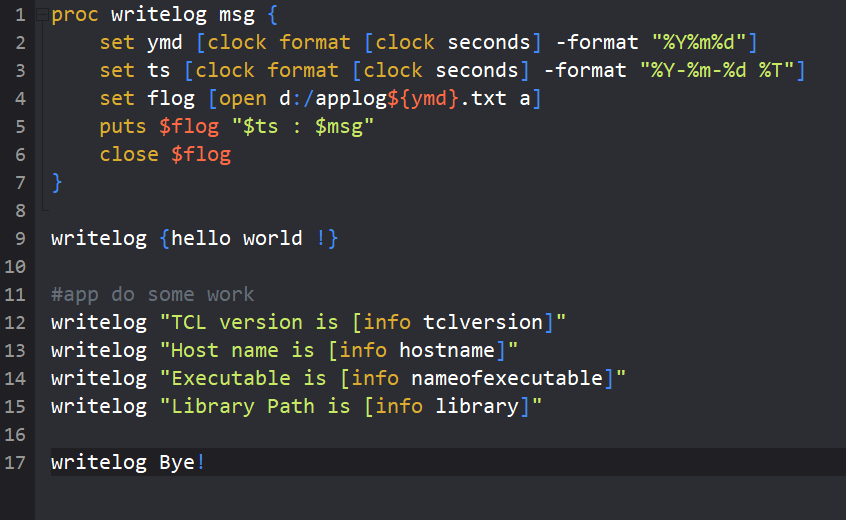 Line 1 to 7 is a proc definition named writelog with a parameter. Parameter will contain message to be written to log file located in d:/applogYYYYMMDD.txt based on current date of clock command. Different day will have a different log file.